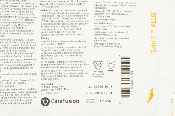- CareFusion 4306CSP Safe-T PLUS Lumbar Puncture Tray w/Ndle 22Ga x 3 1/2inch (x)