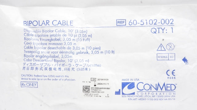 - ConMed 60-5102-002 Disposable Bipolar Cable 10 Fr.