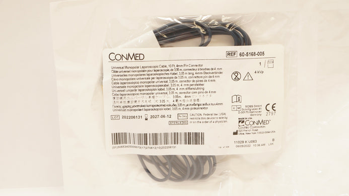 ConMed 60-5168-005 Universal Monopolar Laparoscopic Cable 10ft 4mm Pin Connector