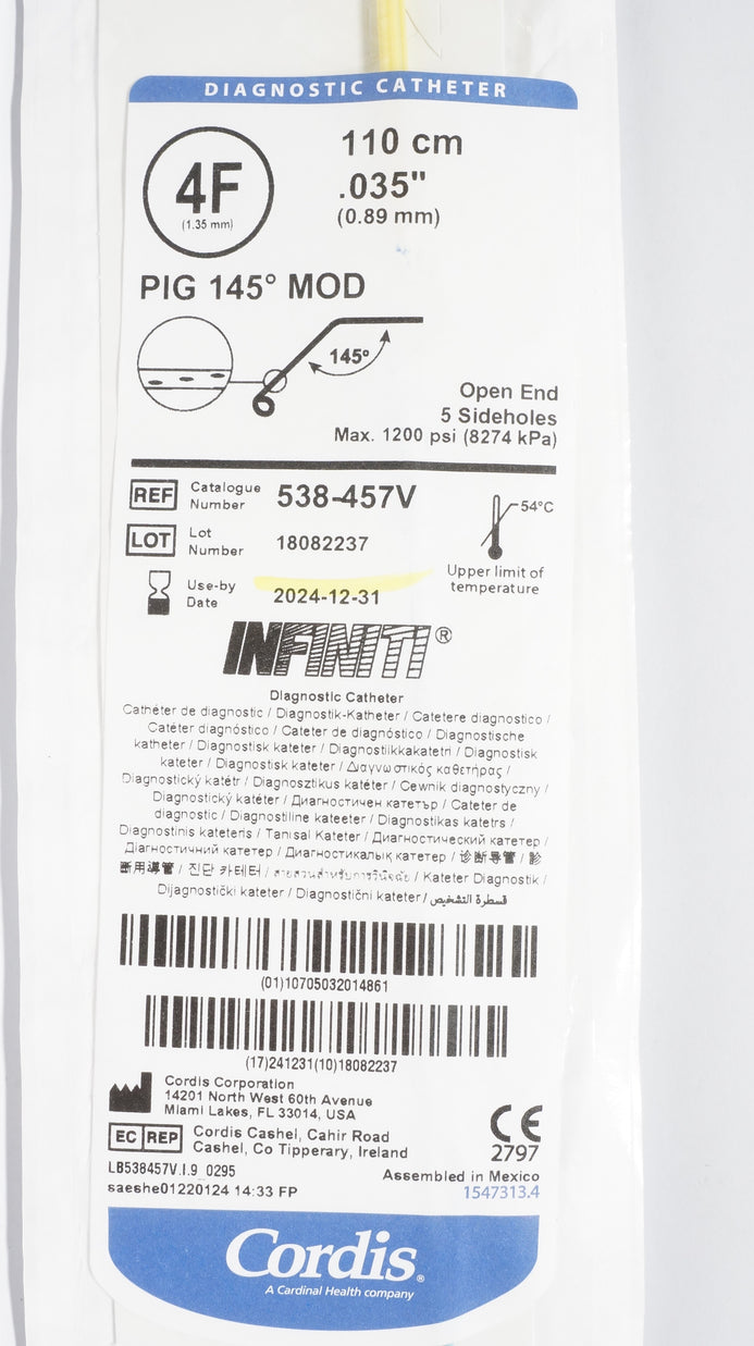 - Cordis 538-457V Infiniti Diagnostic Cath. PIG 145degree MOD 4F x110cm x .038in(x)