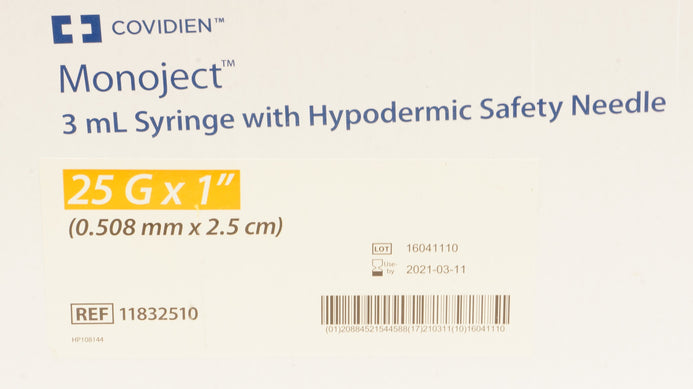 - Covidien 11832510 3ml Syringe with Hypodermic Safety Ndle 25Gx1in-Box of 100 (x)