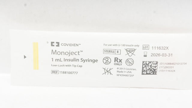 - Covidien 1188100777 Monoject Insulin Syringe 1mL Luer-Lock W/Tip Cap