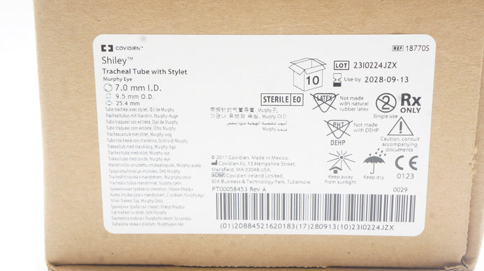 - Covidien 18770S Shiley Tracheal Tube 7.0mm ID x 9.5mm OD x 25.4mm - Box of 10