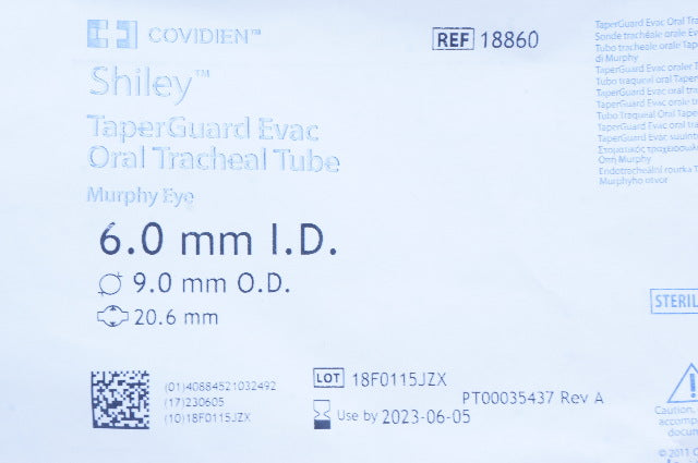- Covidien 18860 Shiley TaperGuard Evac Oral Tracheal Tube 6.0 x 9.0 x 20.6mm