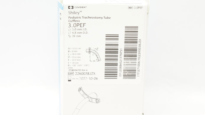 Covidien 3.0PEF Shiley Pediatric Tracheostomy Tube 3.0mm ID x 4.8mm OD x 39mm