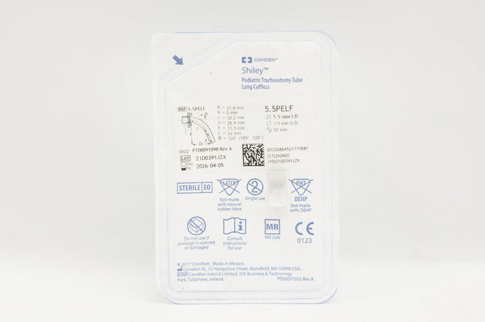 - Covidien 5.5PELF Shiley Pediatric Tracheostomy Tube Long Cuffed 5.5x7.9x52mm