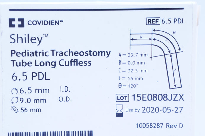 Covidien 6.5 PDL Shiley Pediatric Tracheostomy Tube Long Cuffless 6.5 x 9.0 x 56mm