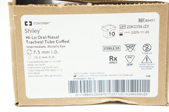 - Covidien 86451 Shiley Hi-Lo Oral/Nasal Tracheal Tube Cuffed 7.5x10.2mm Box of 10