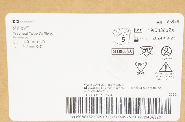 - Covidien 86545 Shiley Tracheal Tube Cuffless - Case of 5