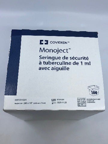 - Covidien 8881511201 Monoject 1mL Tuberculin Safety Syringe W/ Ndle ~ Box of 100
