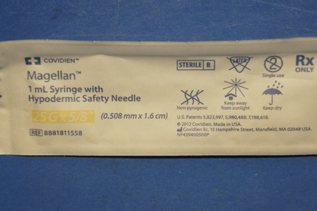 - Covidien 8881811558 Magellan 1mL Syringe with Hypodermic Safety Ndle 25G x 5/8