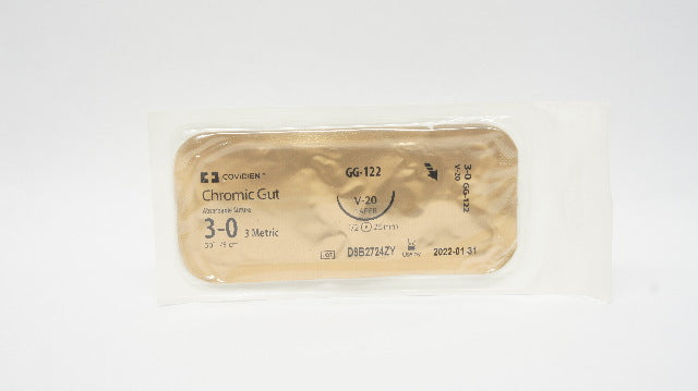 Covidien GG122 Chromic Gut Suture, Taper Point, Size 3-0, 30", Needle V-20 26 mm, 1/2 Circle