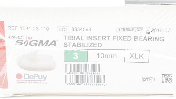 - DePuy 1581-23-110 Tibial Insert Fixed Bearing Stabilized Size 3,10mm, XLK (x)