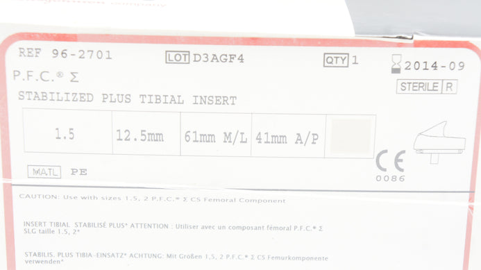 - DePuy 96-2701 Stabilized Plus Tibial Insert 1.5 x 12.5mm x 61mm x 41mm (x)
