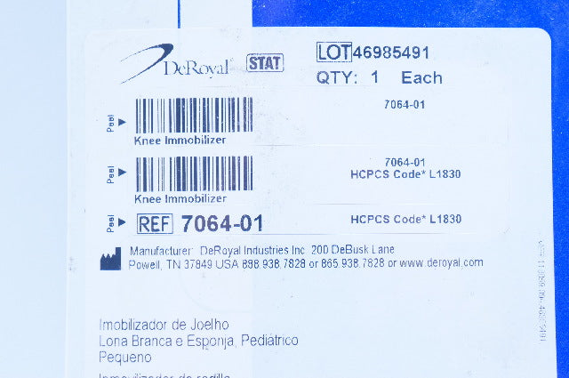 - DeRoyal 7064-01 Knee Immobilizer White Canvas and Foam Pediatric Small 8-10 inch