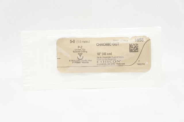 - Ethicon 1658 5-0 CHROMIC GUT Surgical Stre P-2 8.0mm 1/2c Reverse Cutting 18inch