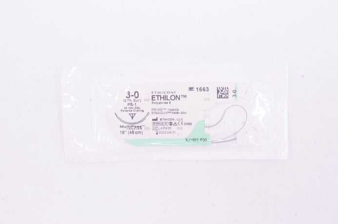 - Ethicon 1663 3-0 Ethilon Stre PS-1 24mm 3/8c Reverse Cutting 18inch (x)