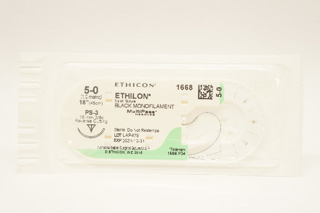 - Ethicon 1668 5-0 ETHILON PS-3 16mm 3/8c Reverse Cutting 18inch (x)