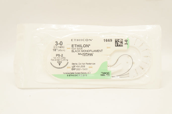 - Ethicon 1669 3-0 ETHILON Nylon, PS-2, 19mm 3/8c Reverse Cutting, 18inch (x)