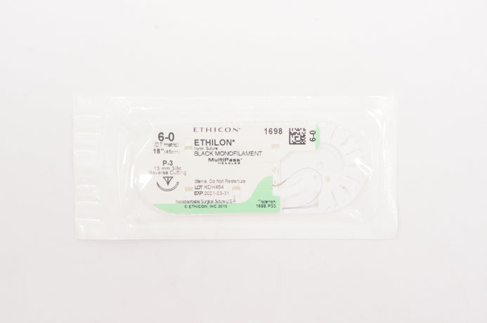 - Ethicon 1698 6-0 ETHILON Stre P-3 13mm 3/8c Reverse Cutting 18inch (x)