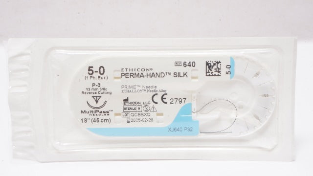 - Ethicon 640 5-0 Perma-Hand Silk Stre P-3 13mm 3/8c Reverse Cutting 18inch