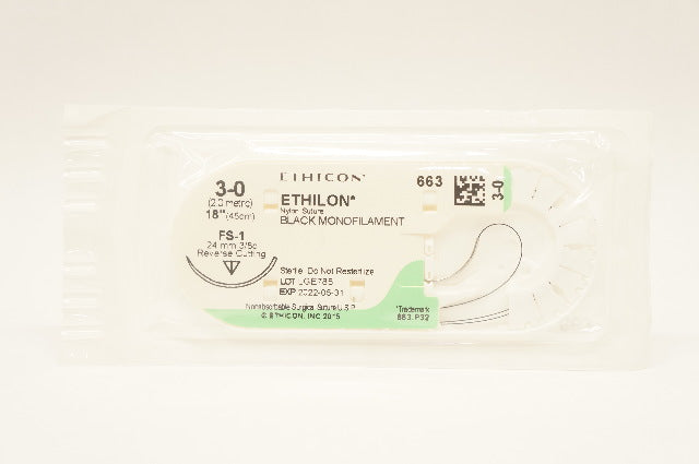 - Ethicon 663 3-0 Ethilon Nylon Stre. FS-1, 24mm 3/8c Reverse Cutting, 18inch (x)