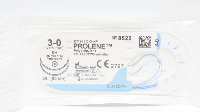 - Ethicon 8522 3-0 Prolene Polypropylene Stre SH 26mm 1/2c Taperpoint, 36inch (x)