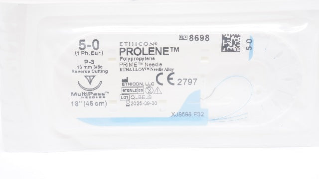 - Ethicon 8698 5-0 PROLENE Stre P-3 13mm 3/8c Reverse Cutting 18inch