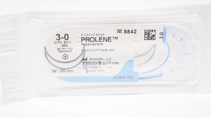 - Ethicon 8842 3-0 Prolene Polypropylene Stre MH 36mm 1/2c Taper, 36 inch