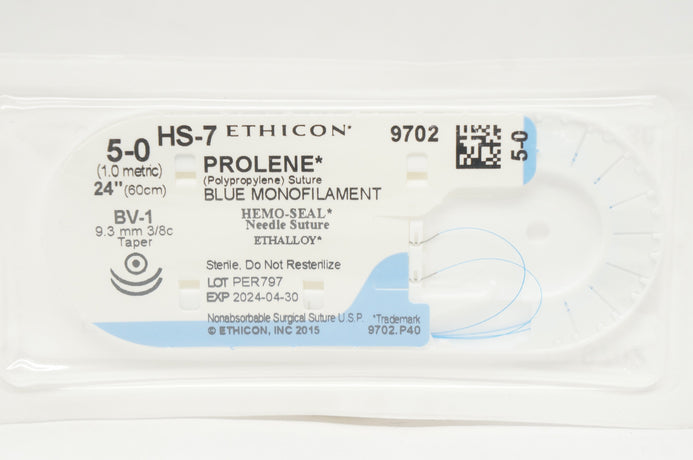 Ethicon 9702 5-0 Prolene Polypropylene Suture Blue Monofilament BV-1 9.3 mm 3/8c Taper, 24 inch
