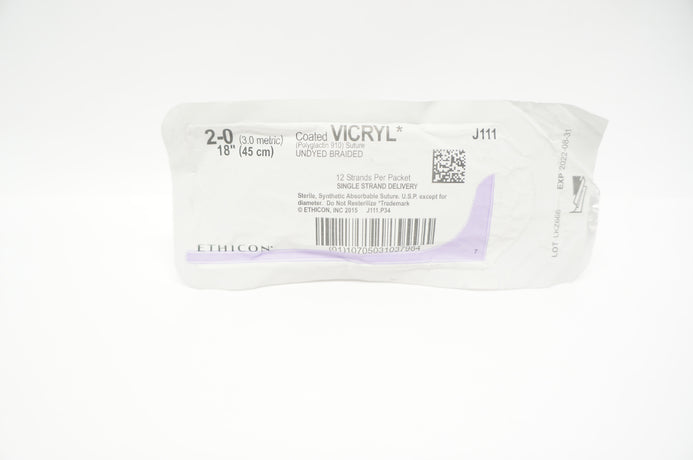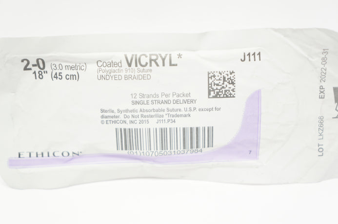 - Ethicon J111 2-0 Coated VICRYL, Undyed Braided, 12 Strands,18inch (x)