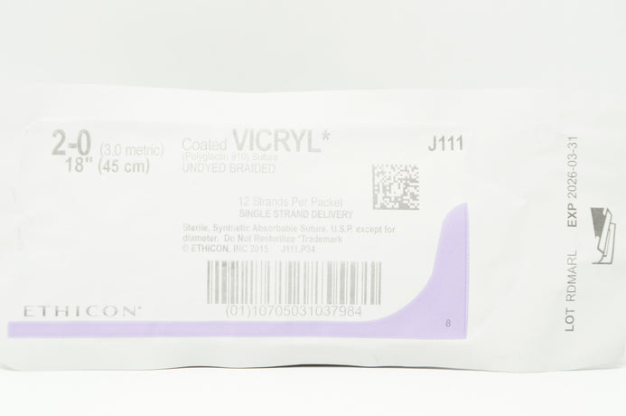 - Ethicon J111 2-0 Coated VICRYL, Undyed Braided, 18inch