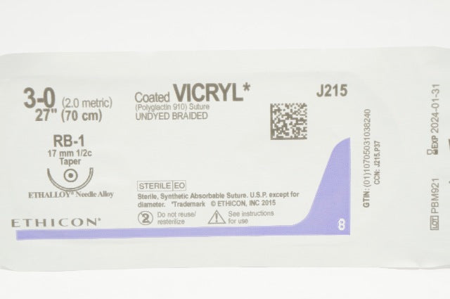 - Ethicon J215 3-0 Coated VICRYL Polyglactin Stre RB-1 17mm 1/2c Taper 27inch (x)