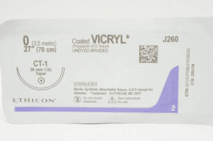 - Ethicon J260 0 VICRYL Undyed Braided Stre CT-1 36mm 1/2c Taper, 27 inch