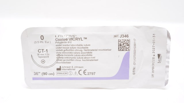 - Ethicon J346 0 Coated VICRYL, CT-1 36mm 1/2c Taper, 36inch