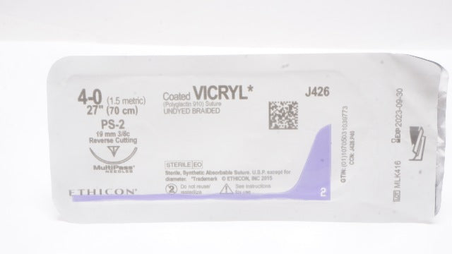- Ethicon J426 4-0 Coated VICRYL PS-2 19mm 3/8c Reverse Cutting, 27inch