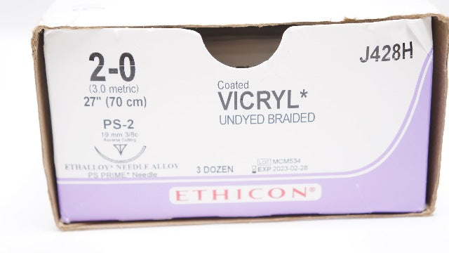 Ethicon J428H 2-0 VICRYL, PS-2, 19mm 3/8c Reverse Cutting, 27inch (x) - Box of 31