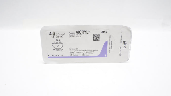 - Ethicon J496 4-0 Coated VICRYL PS-2 19mm 3/8c Reverse Cutting, 18inch