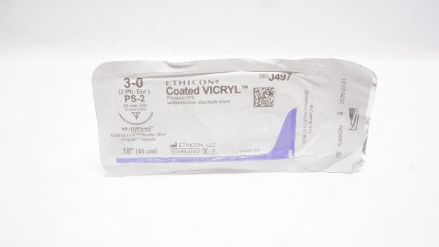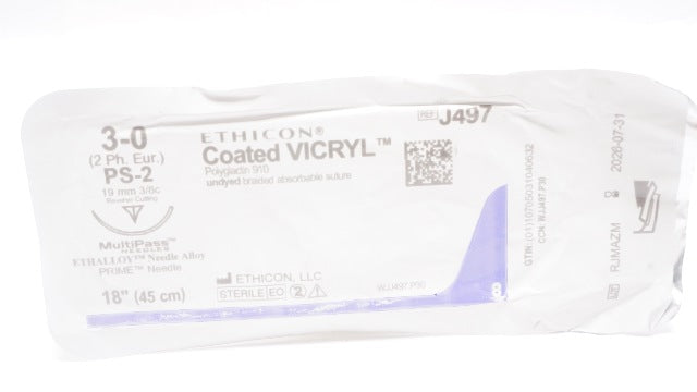 - Ethicon J497 3-0 Coated VICRYL Stre PS-2 19mm 3/8c Reverse Cutting,18inch