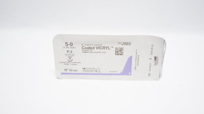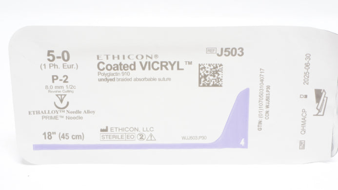 - Ethicon J503 5-0 Coated VICRYL Stre P-2 8mm 1/2c Reverse Cutting 18inch (x)