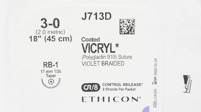 Ethicon J713D 3-0 Coated VICRYL (Polyglactin 910) Suture Violet Braided RB-1 17mm 1/2c Taper 18 in CR/8