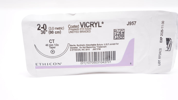 - Ethicon J957 2-0 Coated VICRYL Undyed Braided Stre CT 40mm 1/2c Taper, 36inch