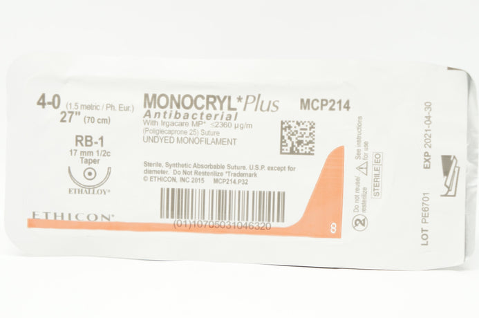 Ethicon MCP214 4-0 Monocryl Plus Antibacterial, RB-1 17mm 1/2c Taper, 27inch (x)