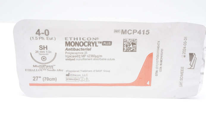 Ethicon MCP415 4-0 Monocryl Plus Stre SH 26mm 1/2c Taperpoint, 27inch (x)