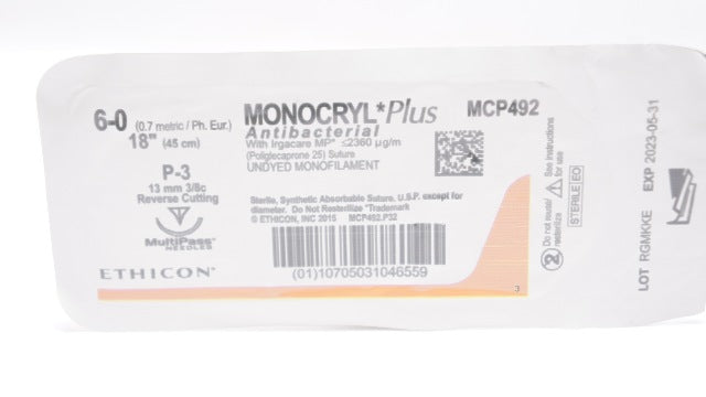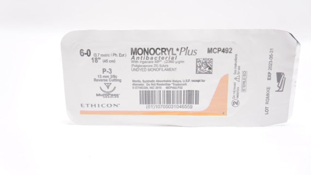 - Ethicon MCP492 6-0 MONOCRYL Plus, P-3, 13mm 3/8c Reverse Cutting, 18inch (x)