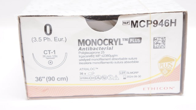 - Ethicon MCP946H 0 MONOCRYL Plus, CT-1, 36mm 1/2c Taper, 36inch - Box of 36