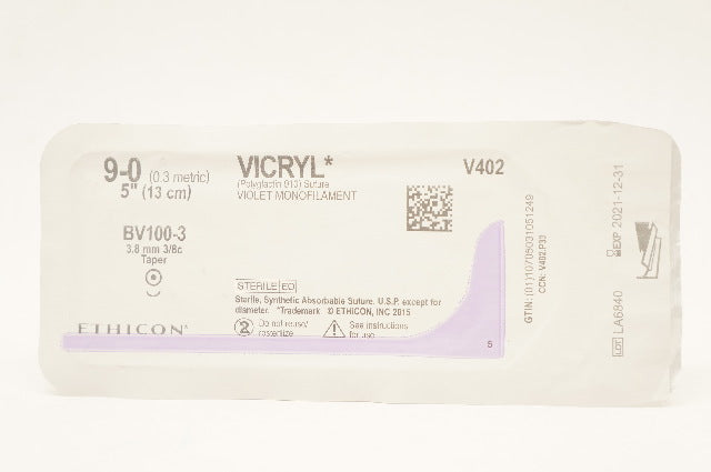 - Ethicon V402 9-0 VICRYL, BV100-3 3/8mm 3/8c Taper, Violet Monofilament, 5inch(x)