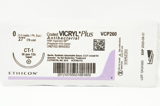 Ethicon VCP260 0 Coated VICRYL Plus Antibacterial With Irgacare MP Polyglactin 910 Suture Undyed Braided CT-1 36mm 1/2c, 27inch