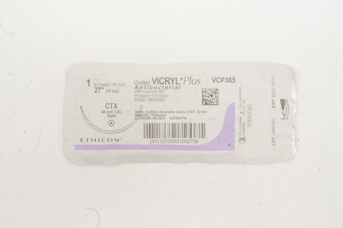 - Ethicon VCP365 1 VICRYL Plus, CTX, 48mm 1/2c Taper, 27inch