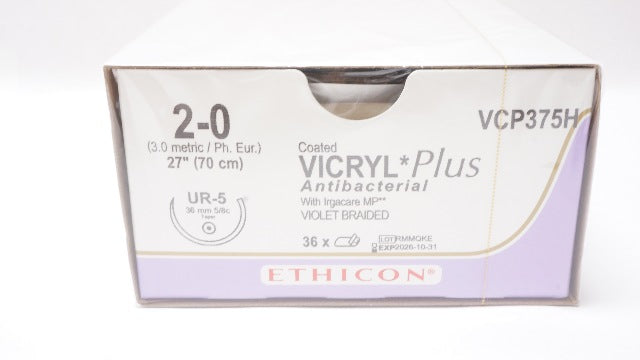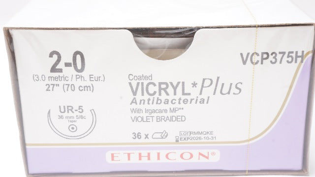 - Ethicon VCP375H 2-0 VICRYL Plus, UR-5, 36mm 5/8c Taper, 27inch - Box of 36